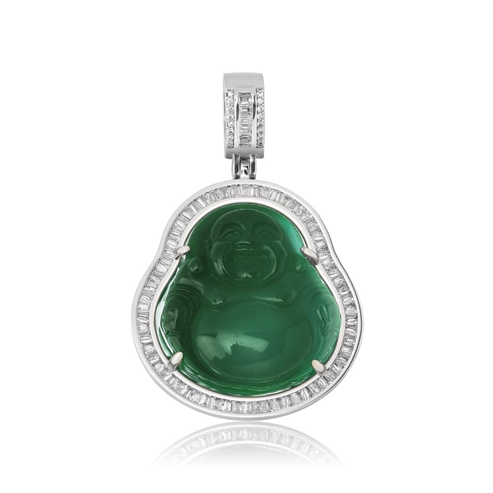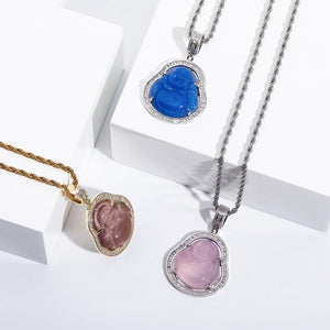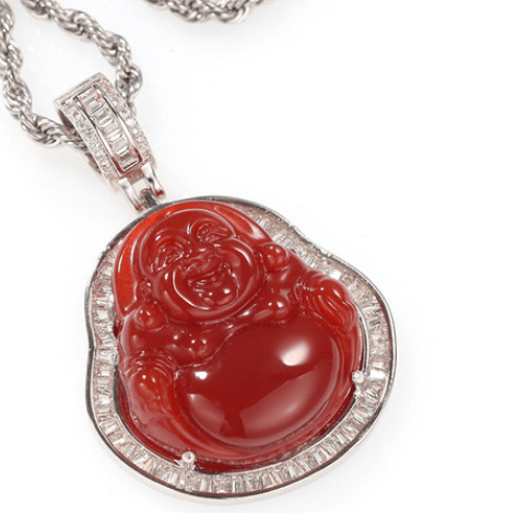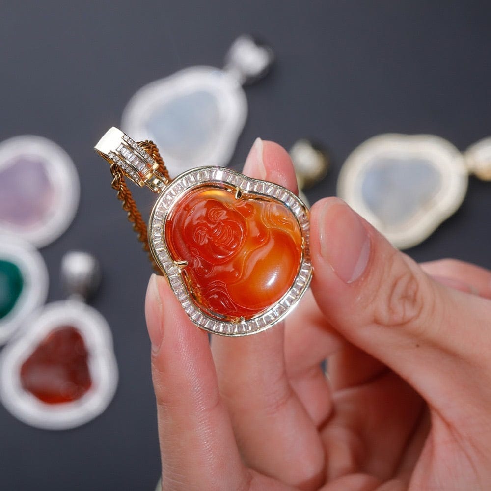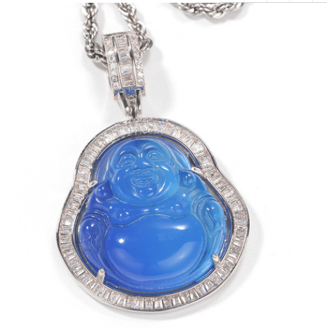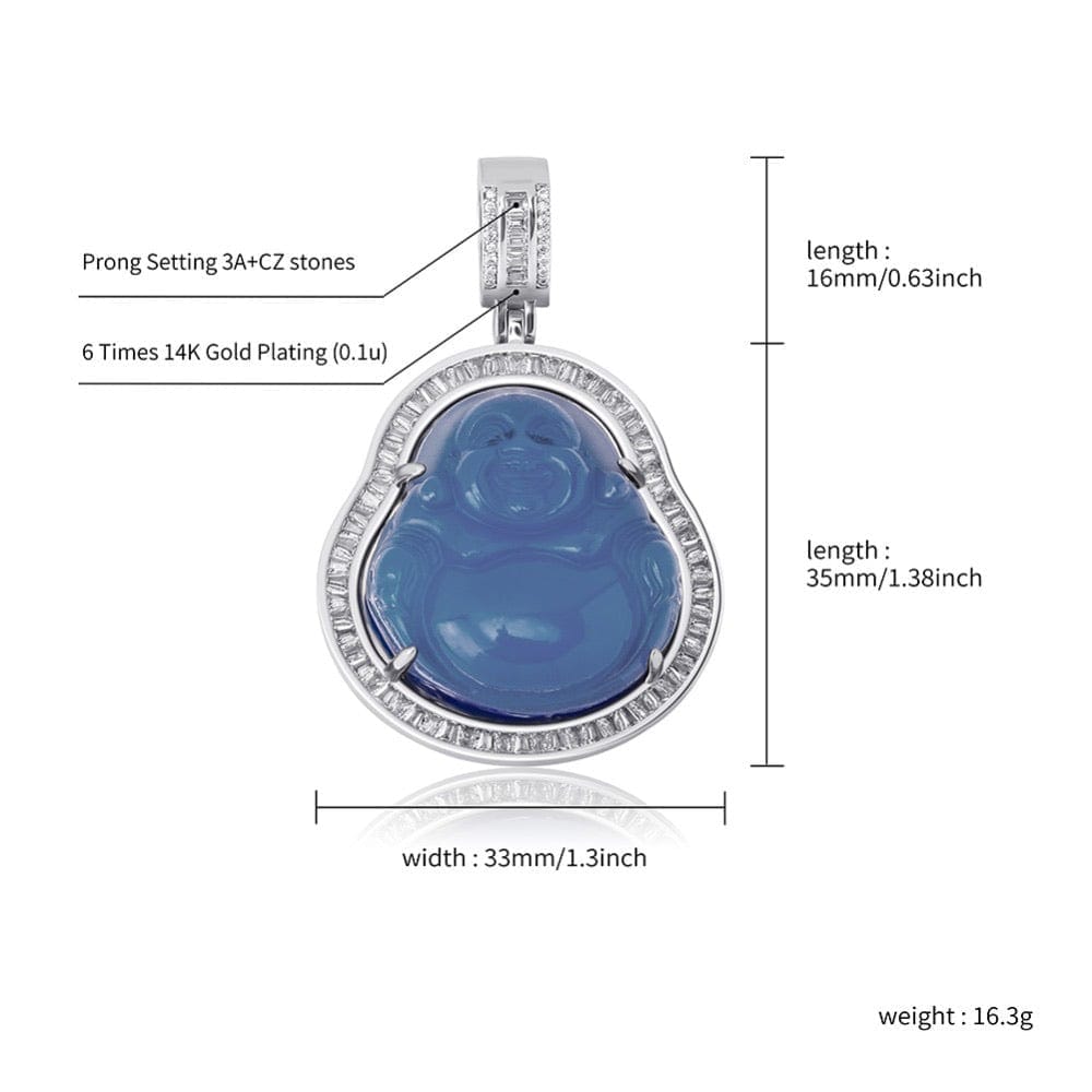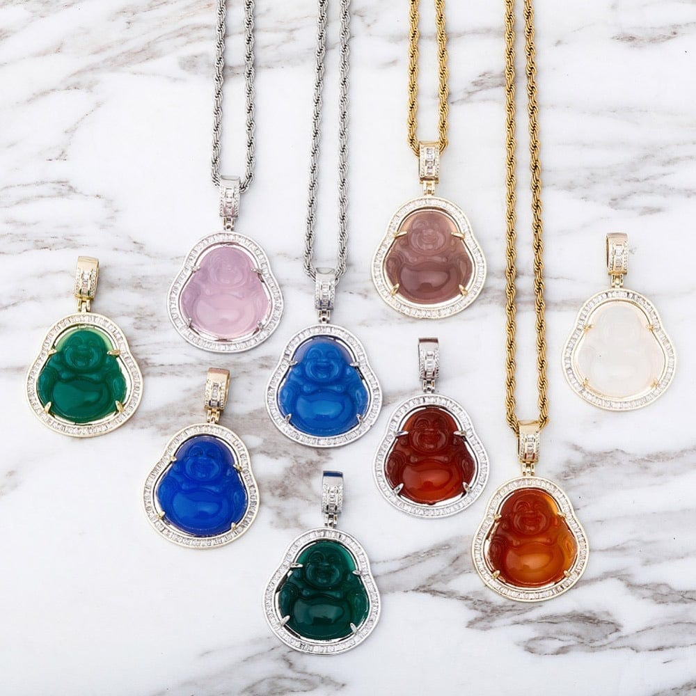 Light up the room with this high-quality agate jade Buddha pendant necklace. Each pendant features an agate jade center and is plated with 18k gold for long-lasting color and shine. Available with a rope or Cuban chain at no extra cost.