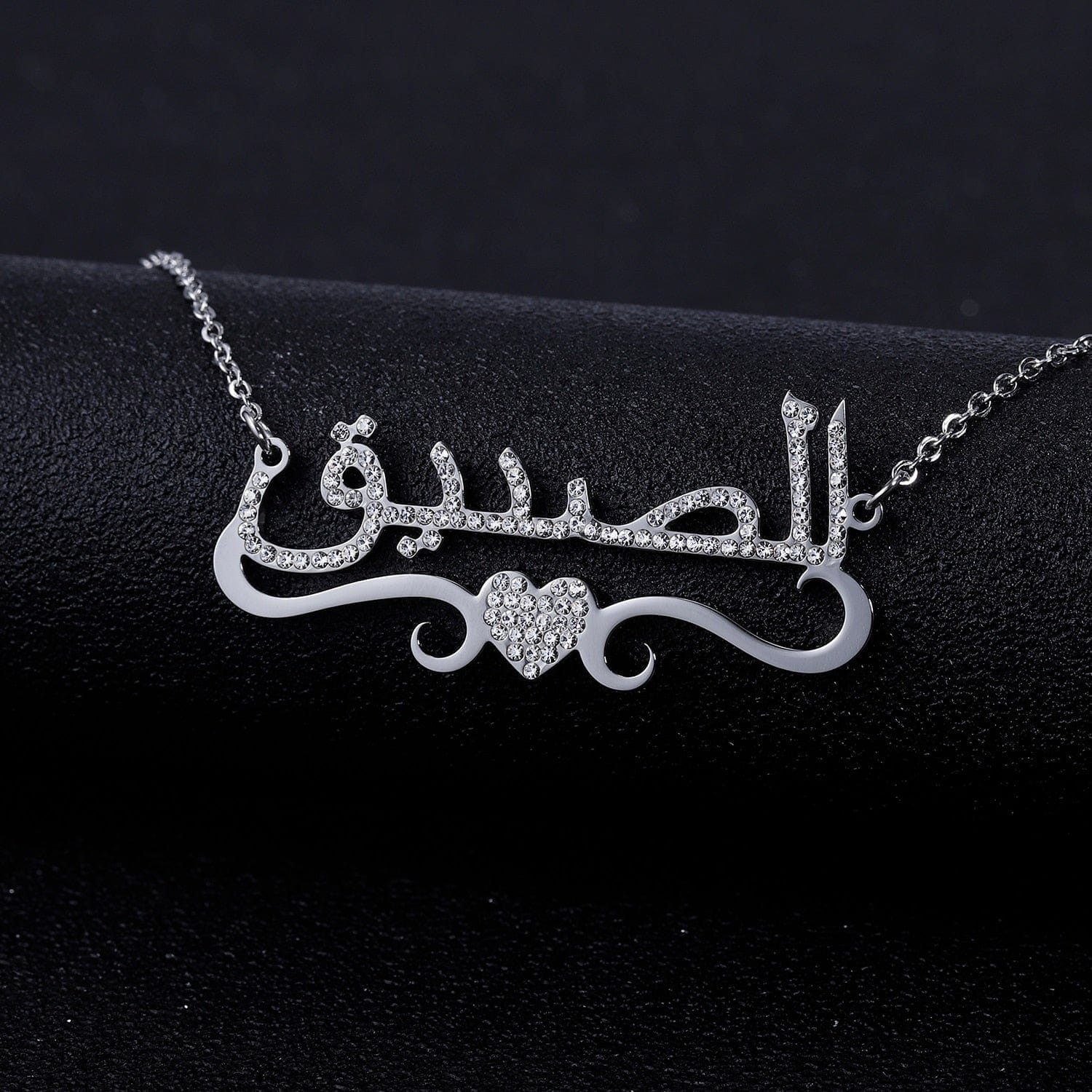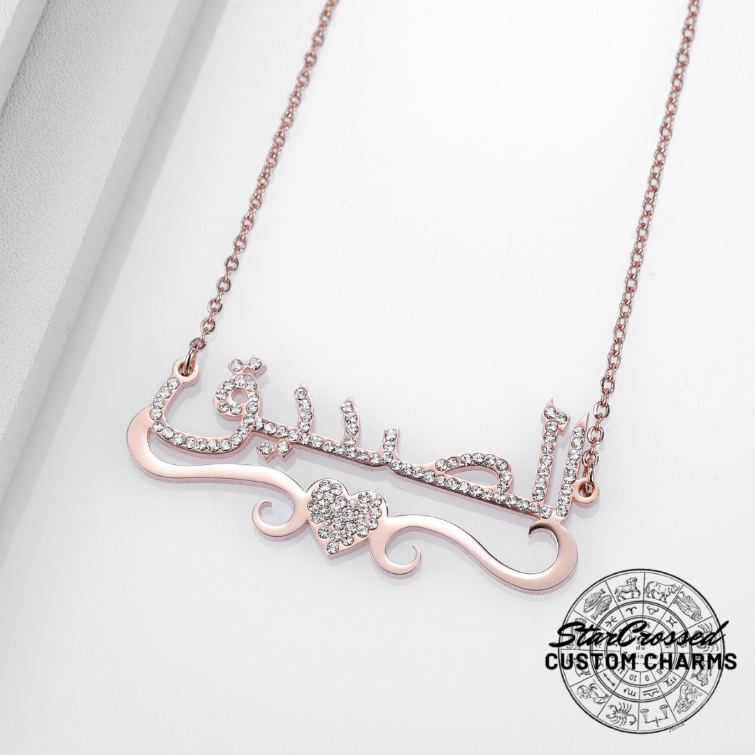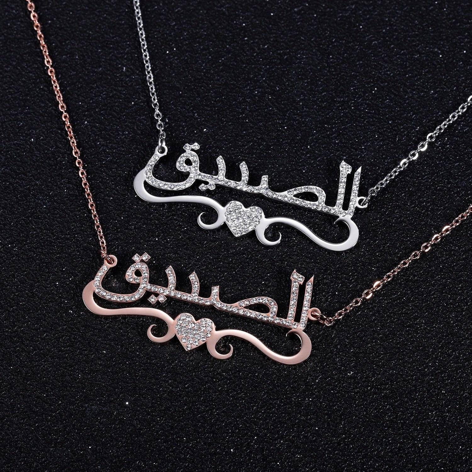 These stunning, high quality laser cut Arabic Script Custom Nameplate Necklaces With Heart Accent scream elegance and style! Goes with every look and comes in Rose Gold or Platinum Plated!