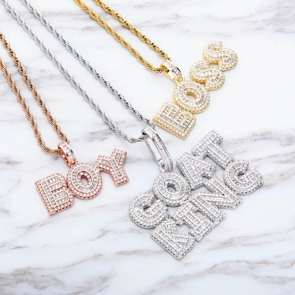 Custom Baguette Letters Pendant With Rope, Cuban or Tennis Necklace