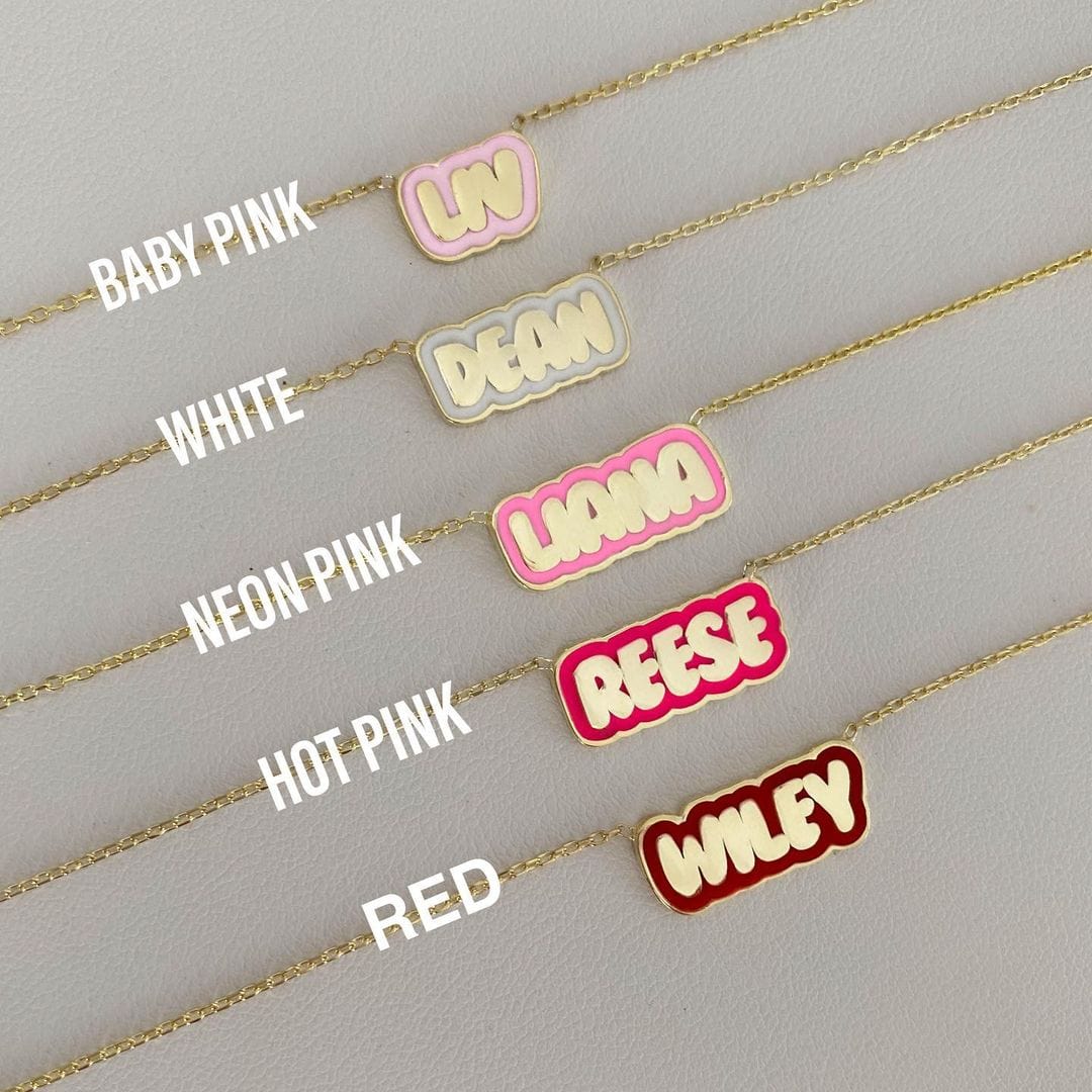 These beautiful, eye-catching Custom Colored Enamel Bubble Letter Name Necklaces are the perfect gift to complement any stylish look! The enamel is available in Baby Pink, White, Neon Pink, Hot Pink, Red, Orange, Blue, Yellow, Purple, and Black, The attached necklaces are available in vacuum-coated 18k Gold, Rose Gold, or Silver!