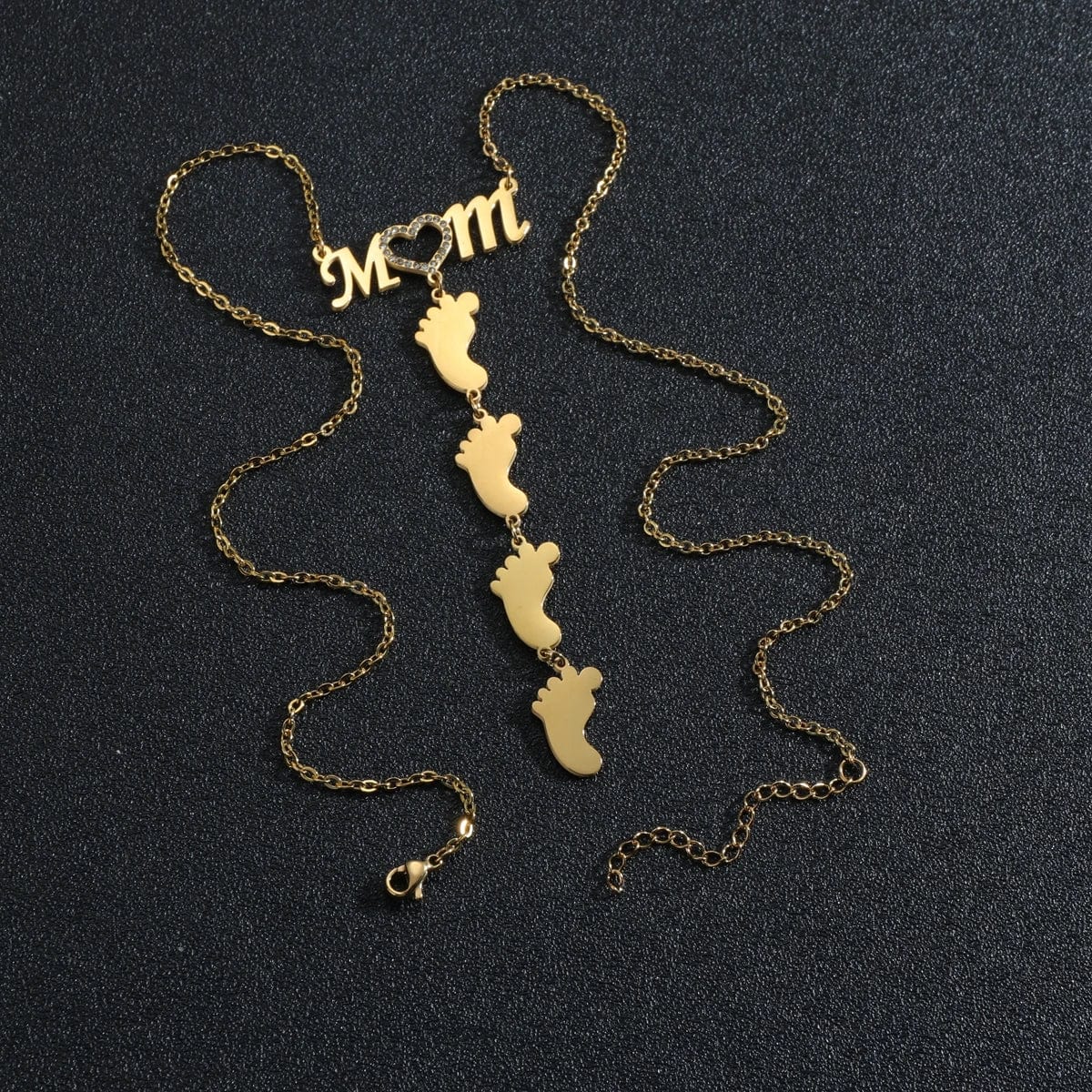 Introducing our heartfelt Custom Mother's Necklace with Names, a tribute to maternal love and connection. Featuring a 'mom' text pendant accompanied by hanging pendants—choose from adorable paw prints, delicate footprints, or boy and girl figures—each ready to be engraved with your children's names. Available in radiant 18 PVD coated gold or shimmering silver, this necklace symbolizes the cherished bond between a mother and her children, a beautiful keepsake to celebrate that special connection.