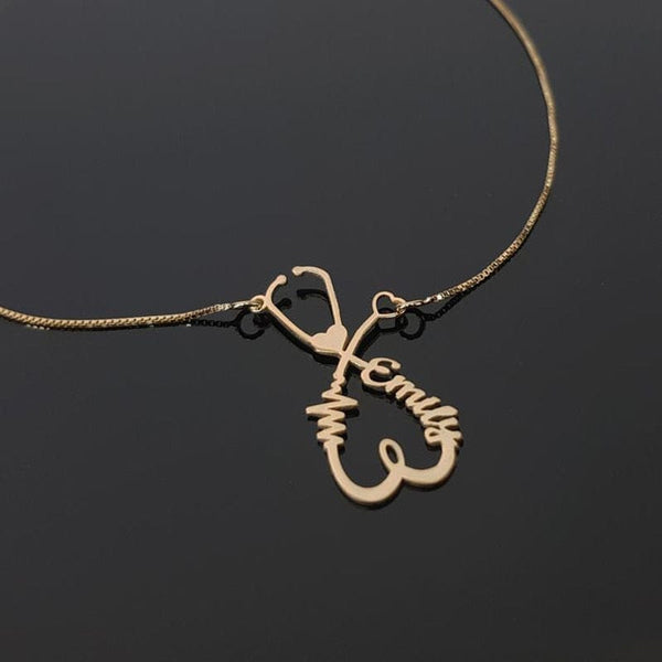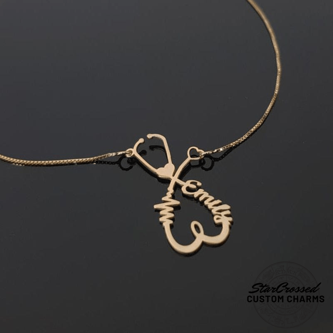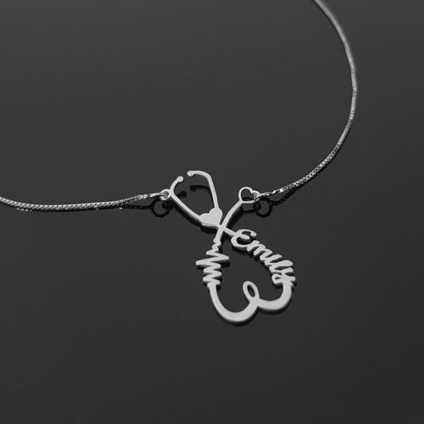Custom Nurse Necklace With Name, Heartbeat & Stethoscope Pendant
