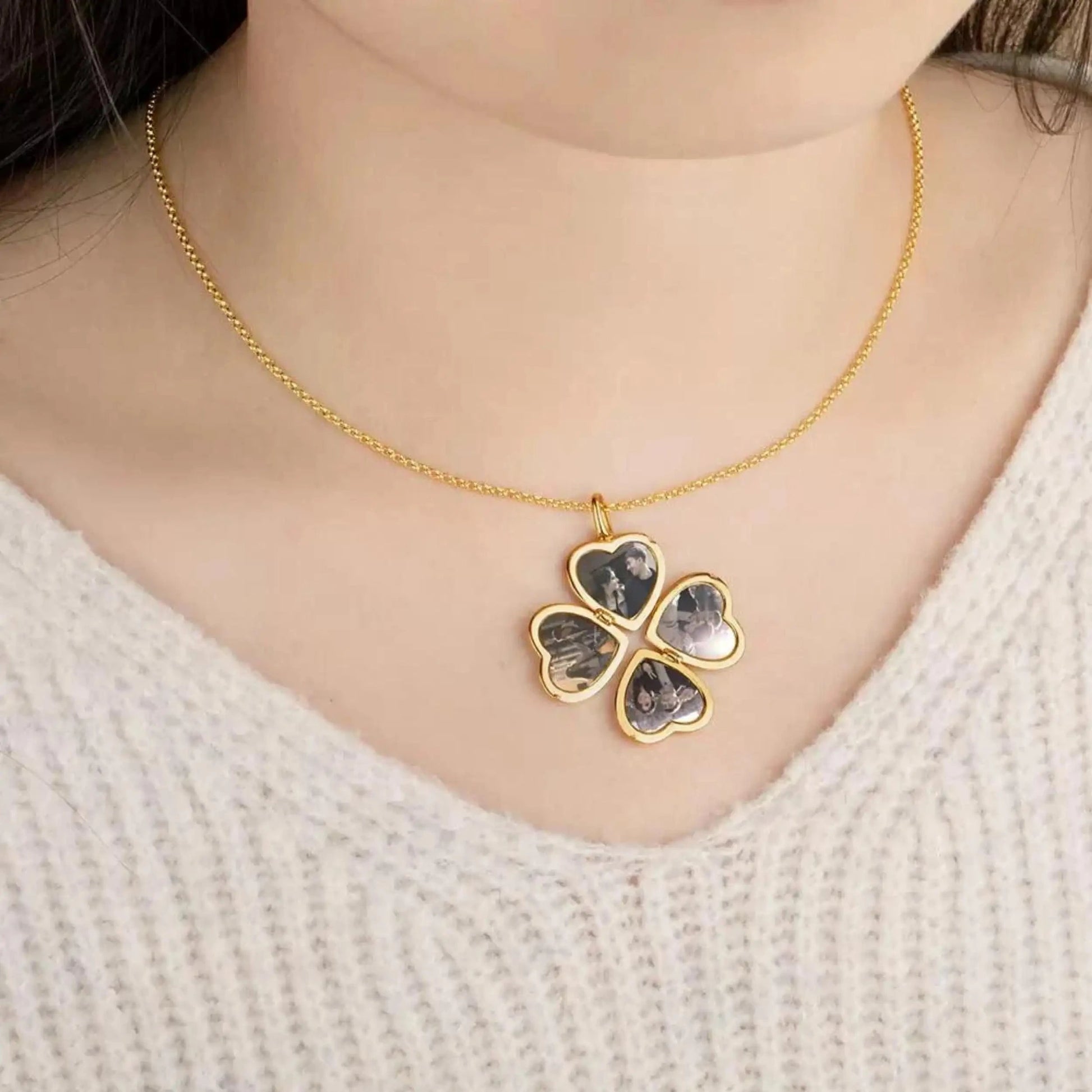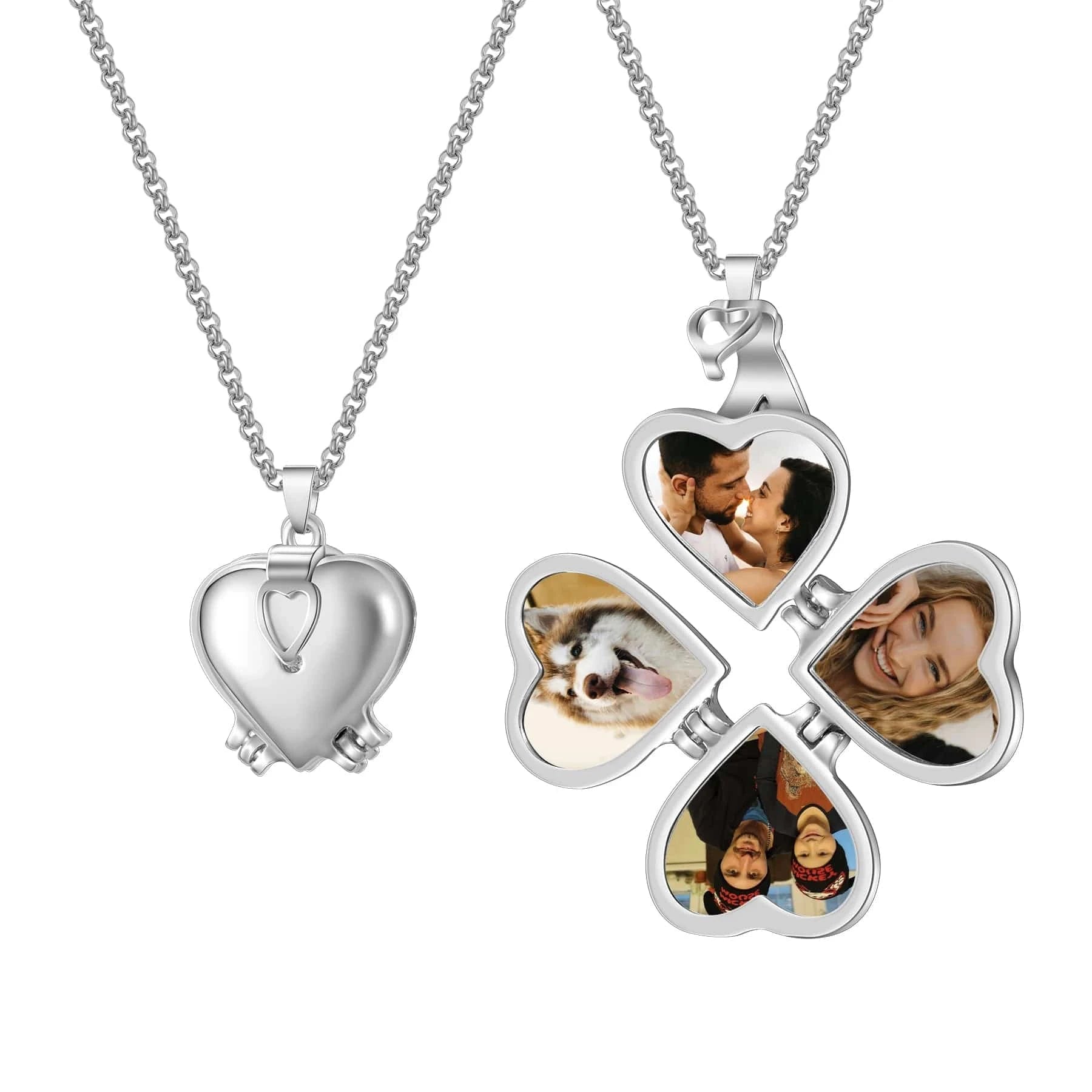 Four Picture Locket Necklace - Four Leaf Clover Heart Design With Personalized Photos