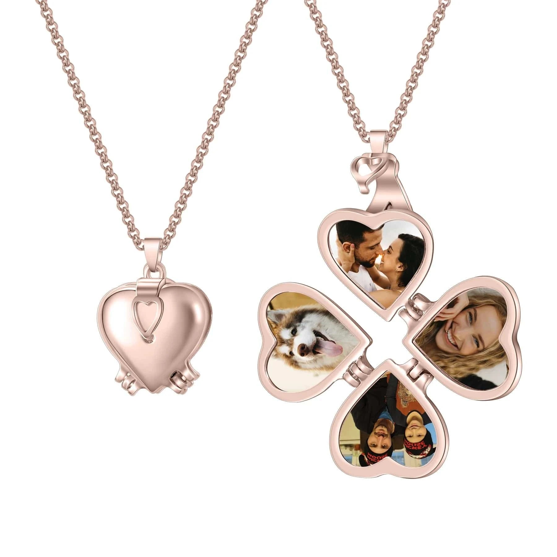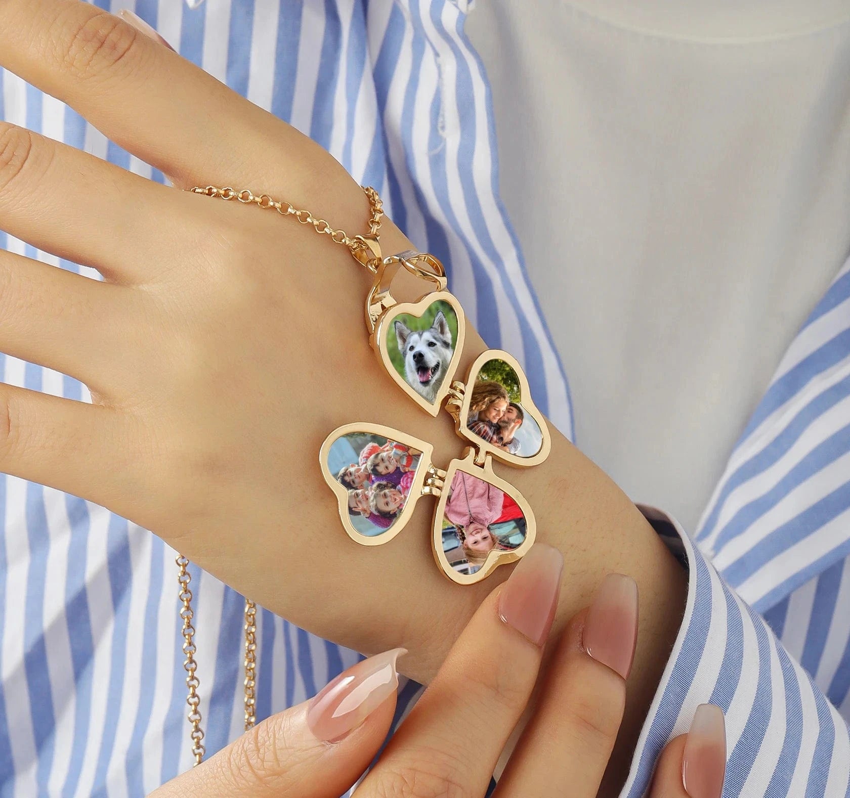 Cherish your memories with our unique custom "Four-photo Heart Locket Necklace". This special piece unfolds into four hearts, each holding a photo, forming a beautiful clover shape. Perfect for capturing moments close to your heart, this necklace is an ideal gift for loved ones. Personalize it with your favorite photos and wear your memories.