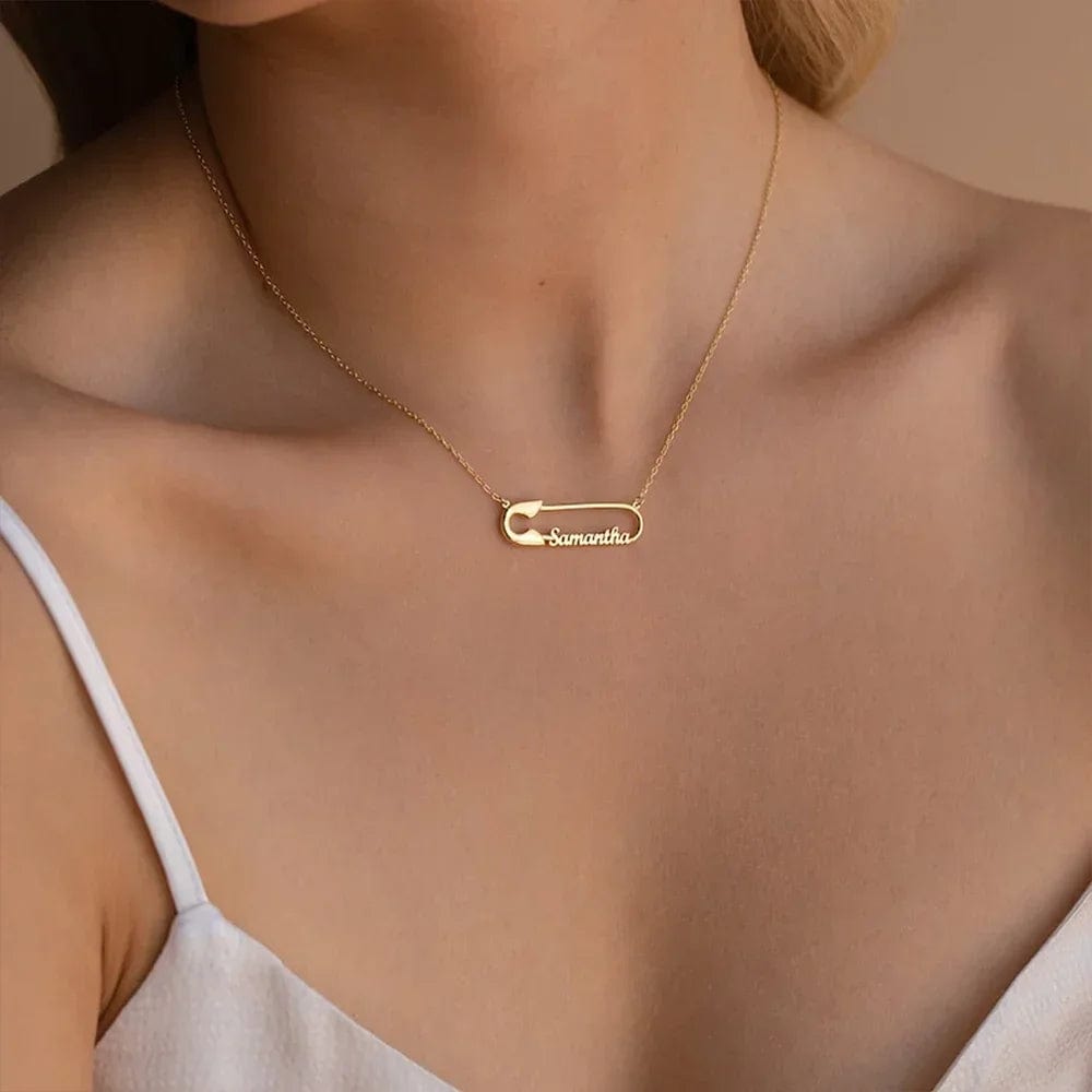 Introducing our unique Custom Safety Pin Name Necklace, a modern twist on personalized elegance. Crafted in 18k PVD coated gold, rose gold, or white gold, this exquisite necklace offers the option to customize with one or two names. Embrace individuality and style with this contemporary piece, a perfect blend of personalization and fashion-forward design.