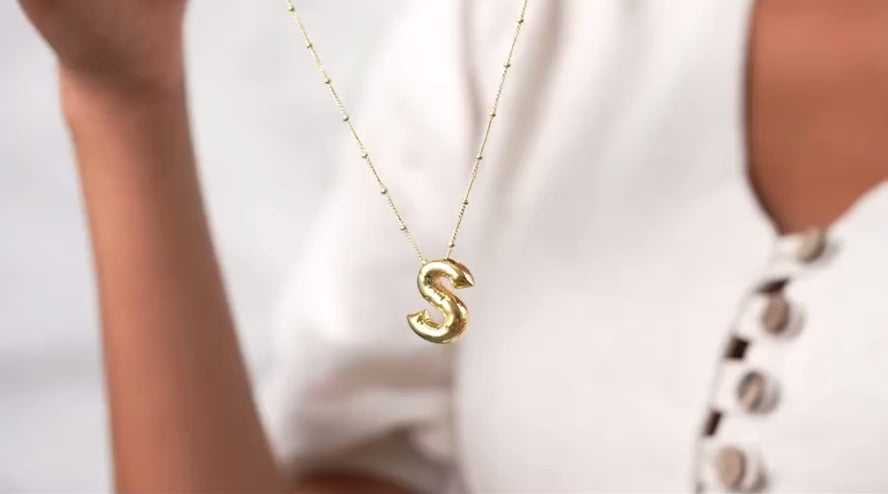 Introducing our stunning collection of dainty gold balloon-style initial letter pendant necklaces. Each pendant, available in all 26 letters of the alphabet, boasts a charming blow-up balloon design, delicately coated with shimmering 18K gold using PVD technology. Elevate your style with these personalized, elegant pieces that capture the essence of individuality in every wear.