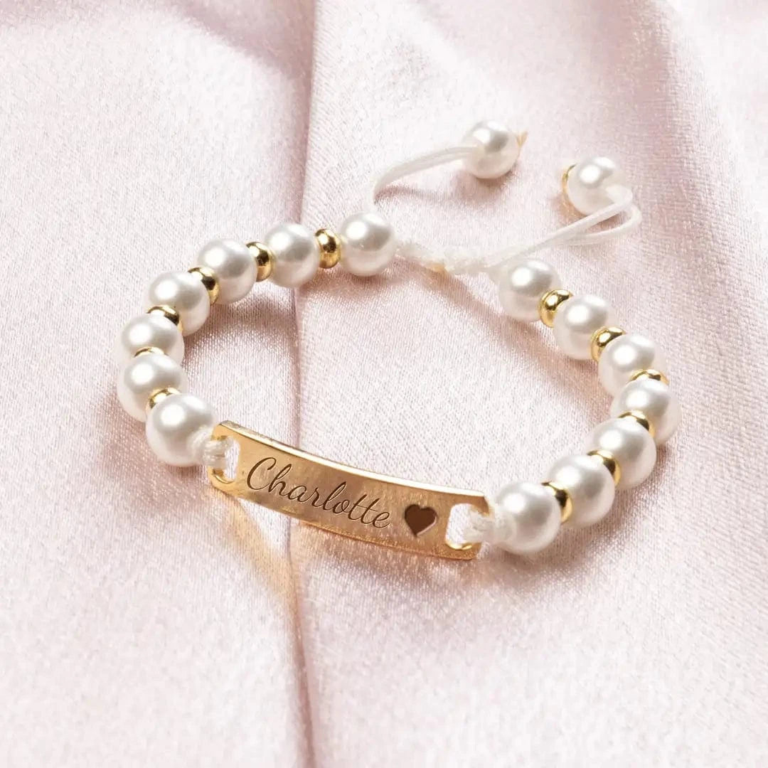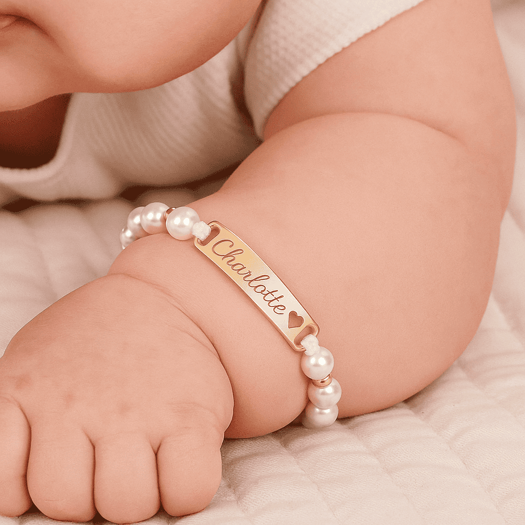 Delicate yet durable, our Adjustable Pearl Baby Bracelet features lustrous pearls and a sleek, engravable nameplate—perfect for adding a custom name or meaningful word. Designed to grow with your child, it adjusts for a comfortable fit and comes in your choice of PVD-coated 18k Gold, Rose Gold, or Silver for lasting shine and hypoallergenic wear. A keepsake they’ll treasure forever.