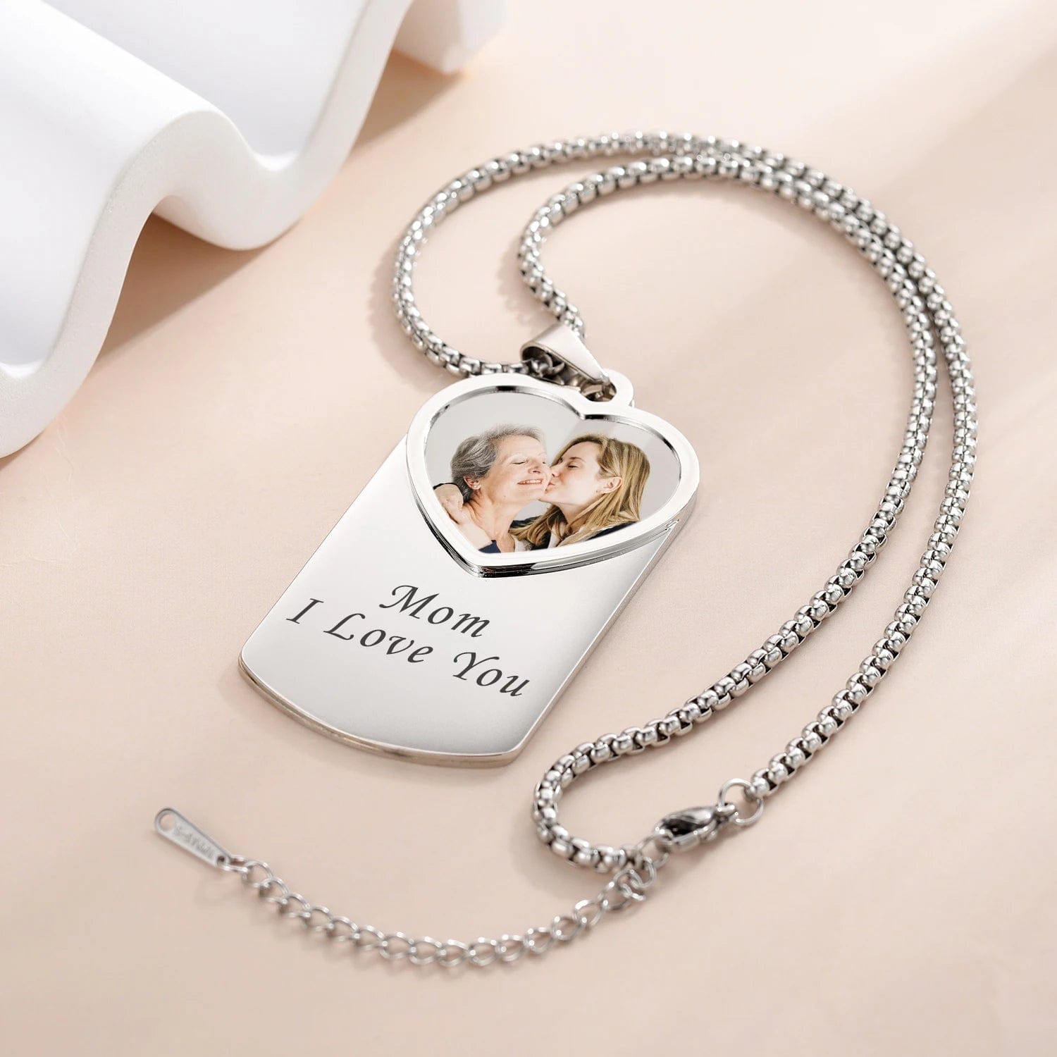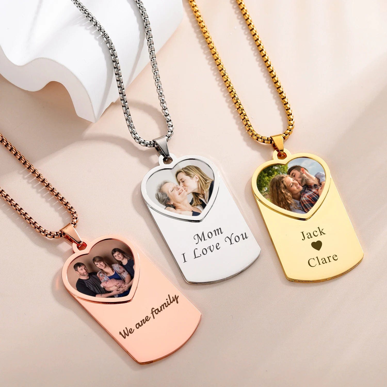 Embrace your memories in style with our Heart Photo Dog Tag Photo Necklace, available in exquisite 18k PVD coated gold and white gold finishes. This elegant piece features a heart-shaped photo frame nestled within the classic dog tag design. Carry your cherished moments close to your heart while adding a touch of sophistication to your look with this customizable necklace.