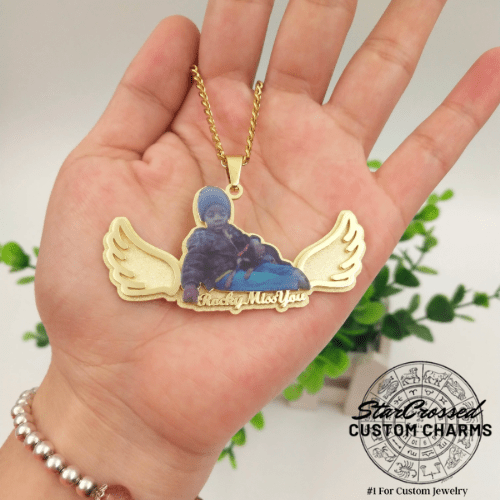 Featuring a laser-outlined design that brings the photo to life, this custom picture chain can be personalized with any photo and name or message that you choose! VacuumĀ coated with real 18k gold not to tarnish and framed with wings, this high-quality statement piece is great for memorializing your living and heavenly angels š!